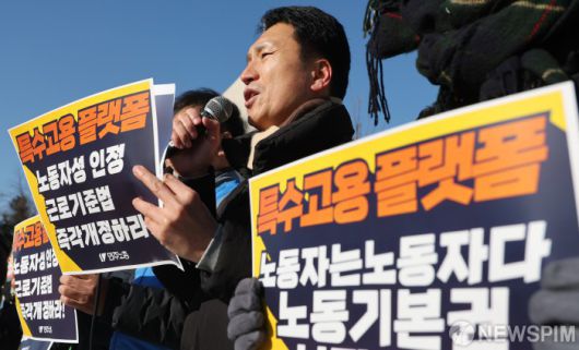 [서울=뉴스핌] 이형석 기자 = 전국민주노동조합총연맹이 21일 오전 서울 여의도 국회 앞에서 ‘근로기준법 개정으로 특수고용·플랫폼 노동자 노동기본권 보장하라!’ 기자회견을 열고 있다. 2026.01.21 leehs@newspim.com