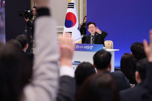 이재명 대통령이 21일 오전 청와대 영빈관에서 2026 신년 기자회견 ‘함께 이루는 대전환, 모두 누리는 대도약’에서 취재진의 질문을 받고 있다. 20260121 청와대사진기자단 |