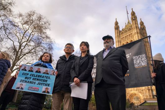 [런던=AP/뉴시스] 20일(현지 시간) 영국 런던 웨스트민스터에 모인 시위자들이 새 중국대사관에 반대하는 현수막을 들고 있다. 2026.01.21 |