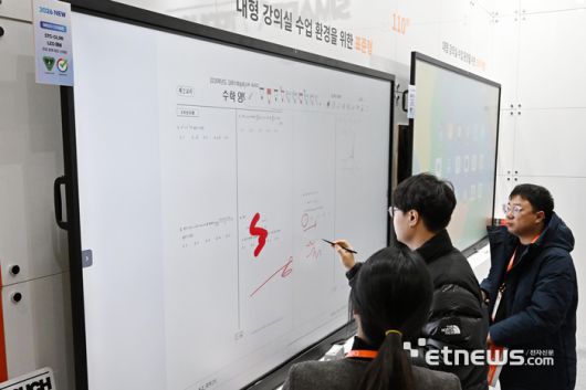 국내 최대 규모의 교육·에듀테크 전문 전시 제23회 대한민국 교육박람회가 21일 서울 강남구 코엑스에서 열렸다. 참관객이 스마트터치의 LED 전자칠판을 살펴보고 있다. 이동근기자 foto@etnews.com [Copyright © 전자신문. 무단전재-재배포금지]