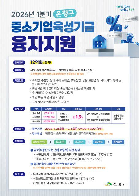 신청 기간은 오는 26일부터 다음 달 6일까지다. 사전에 서울신용보증재단 은평종합지원센터 또는 신한은행 은평구청지점에서 보증서 발급과 부동산 담보 상담을 받은 뒤 구청 일자리경제과를 방문해 신청서를 제출하면 된다.