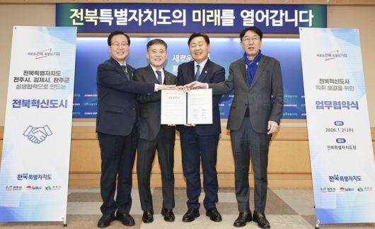 전북자치도는 21일 도청 4층 회의실에서 김관영 도지사와 우범기 전주시장, 정성주 김제시장, 유희태 완주군수가 참석한 가운데 혁신도시 악취 해결을 위한 업무협약을 체결했다.