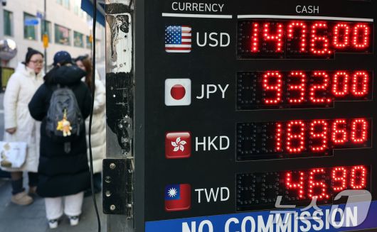 (서울=뉴스1) 최지환 기자 = 21일 서울 명동 환전소 전광판에 환율 시세가 게시되어 있다. 이재명 대통령은 이날 신년 기자회견에서 연일 계속되는 고환율 기조에 대해 "책임 당국에 의하면 한두 달 정도 지나면 1400원 전후로 떨어질 것이라고 예측들을 한다"고 발언했다. 2026.1.21/뉴스1