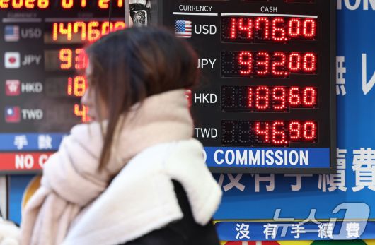 (서울=뉴스1) 최지환 기자 = 21일 서울 명동 환전소 전광판에 환율 시세가 게시되어 있다. 이재명 대통령은 이날 신년 기자회견에서 연일 계속되는 고환율 기조에 대해 "책임 당국에 의하면 한두 달 정도 지나면 1400원 전후로 떨어질 것이라고 예측들을 한다"고 발언했다. 2026.1.21/뉴스1