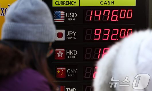 (서울=뉴스1) 최지환 기자 = 21일 서울 명동 환전소 전광판에 환율 시세가 게시되어 있다. 이재명 대통령은 이날 신년 기자회견에서 연일 계속되는 고환율 기조에 대해 "책임 당국에 의하면 한두 달 정도 지나면 1400원 전후로 떨어질 것이라고 예측들을 한다"고 발언했다. 2026.1.21/뉴스1