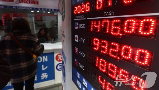 (서울=뉴스1) 최지환 기자 = 21일 서울 명동 환전소 전광판에 환율 시세가 게시되어 있다. 이재명 대통령은 이날 신년 기자회견에서 연일 계속되는 고환율 기조에 대해 "책임 당국에 의하면 한두 달 정도 지나면 1400원 전후로 떨어질 것이라고 예측들을 한다"고 발언했다. 2026.1.21/뉴스1