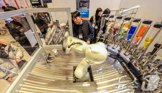 (서울=뉴스1) 이호윤 기자 = 21일 서울 강남구 코엑스에서 열린 ‘2026 호텔페어’를 찾은 관람객들이 칵테일 제작 로봇을 살펴보고 있다. 이번 전시는 호텔 운영 솔루션을 비롯해 공간∙인테리어, 서비스, 어메니티, IT/스마트 솔루션 등 호텔∙숙박 산업 전 분야를 아우르는 기업들이 참가해 실질적인 비즈니스 솔루션을 선보이고 있다. 2026.1.21/뉴스1