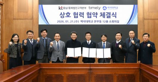 백석대학교가 21일 KT 충남·충북법인고객본부, Timely와 함께 AI 중심대학 구축 및 산업수요 기반 인재 양성을 위한 업무협약을 체결했다.