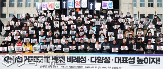 (서울=국제뉴스) 박석운(앞줄 왼쪽 다섯번째) 민중행동 공동대표가 21일 오전 서울 여의도 국회 본청 계단에서 열린 정치개혁을 위한 시민사회-제정당 기자회견에서 발언을 하고 있다./사진=이용우 기자