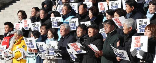 (서울=국제뉴스) 21일 오전 서울 여의도 국회 본청 계단에서 열린 정치개혁을 위한 시민사회-제정당 기자회견에서 참석자들이 손피켓을 들고 있다./사진=이용우 기자
