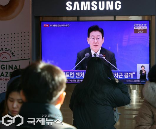 (서울=국제뉴스) 21일 오전 서울역 대합실에서 시민들이 이재명 대통령의 신년 기자회견 생중계를 시청하고 있다./사진=이용우 기자