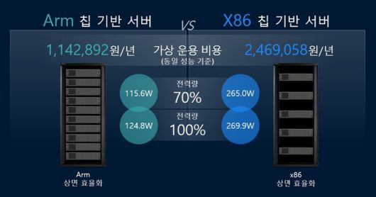 Arm 칩은 설계 구조가 단순하고 최적화돼 있어 코어당 단가가 낮다. 저전력 특성은 전원 장치와 냉각 팬 구성 축소로 이어져 서버 도입 비용과 운영 비용을 동시에 절감한다.
