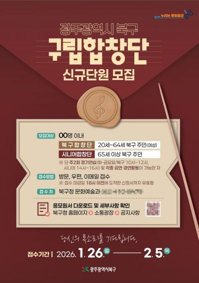 광주 북구가 아름다운 화음으로 지역 사회와 소통할 구립합창단 신규 단원을 공개 모집한다.