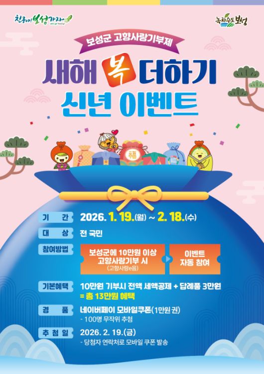 보성군 고향사랑기부제 새해 복 더하기 신년 이벤트 추진_'새해 복 더하기 신년 이벤트'_ 포스터 [사진=전라남도 보성군][전남 광주=팍스경제TV] 전라남도 보성군은 2026년 새해를 맞아 고향사랑기부제 참여를 확대하고 기부 문화를 활성화하기 위해 오는 2월 18일까지 '새해 복 더하기 신년 이벤트'를 추진한다고 밝혔습니다.