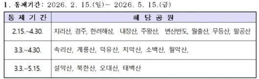 국립공원 별 '봄철 산불조심기간 운영'표./사진제공=국립공원관리공단 |