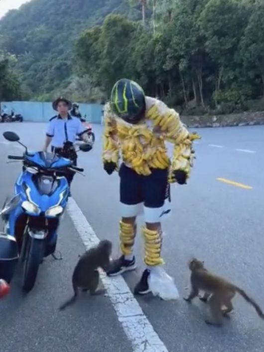 베트남에서 한 외국인 관광객이 야생 원숭이를 유인하기 위해 온몸에 바나나를 두르고 원숭이 서식지로 들어가려는 모습이 포착됐다. SNS 갈무리 |