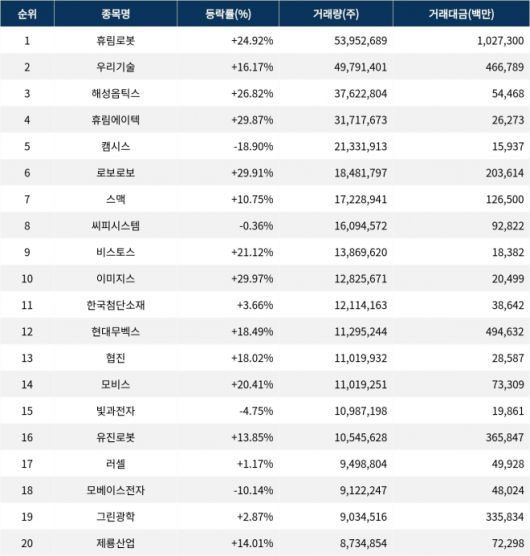 해성옵틱스(076610)는 1480원의 현재가로 3762만 2804주가 거래되며 3위에 올랐다. 등락률은 26.82%의 급등세를 보이고 있다. 휴림에이텍(078590)은 887원의 현재가로 3171만 7673주가 거래되며 29.87%의 급등을 기록하고 있다. 캠시스(050110)는 708원의 현재가로 2133만 1913주가 거래되며 등락률 -18.90%를 보이고 있다. 로보로보(215100)는 상한가에 근접한 29.91% 상승률을 기록하며 1만 8481만 797주가 거래되고 있다. 스맥(099440)은 7210원의 현재가로 1722만 8941주가 거래되며 10.75% 상승을 보인다. 씨피시스템(413630)은 5610원의 현재가로 1609만 4572주가 거래되며 등락률 -0.36%를 보인다. 비스토스(419540)는 1296원의 현재가로 1386만 9620주가 거래되며 21.12%의 상승세를 나타낸다. 이미지스(115610)는 1700원의 현재가로 1282만 5671주가 거래되며 29.97%의 상한가를 기록하고 있다.