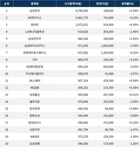 한편 시가총액 20위권 종목들은 SK스퀘어(402340) ▲0.59%, KB금융(105560) ▲0.30%, 삼성물산(028260) ▲0.51%, 셀트리온(068270) ▼1.69%, 한국전력(015760) ▲3.98%, 한화오션(042660) ▼3.60%, 현대모비스(012330) ▲5.32%, 신한지주(055550) ▼1.47%, NAVER(035420) ▼1.95%, 삼성생명(032830) ▼1.26% 등의 성적을 기록하고 있다.