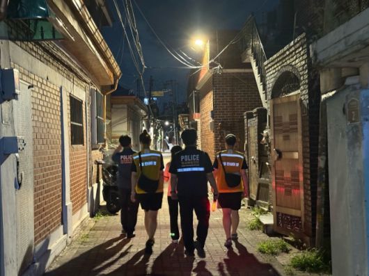 지난해 8월 동대문구 ‘안심 귀가 스카우트’ 단원과 범죄예방진단 경찰이 이문동 일대 골목을 순찰하고 있다. 동대문구 제공 |