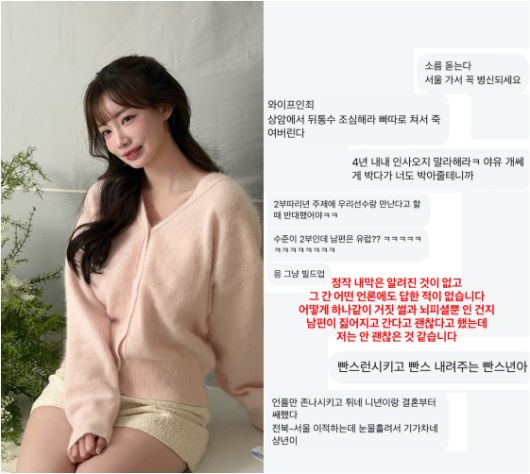 곽민선은 21일 자신의 SNS를 통해 실제로 받은 다수의 DM을 공개했다. 공개된 메시지에는 “소름 돋는다”, ‘서울 가서 XX되라”, “와이프인 죄로 뒤통수 조심해라” 등 협박과 비난이 담겨 있어 충격을 안겼다.