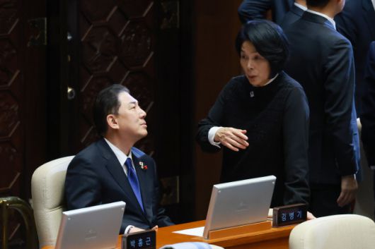 지난달 24일 국회에서 열린 12월 임시국회 본회의에서 김병기 의원이 국회 과학기술정보방송통신위원장인 최민희 더불어민주당 의원과 대화하고 있다. /연합 |