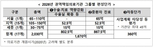 구체적으로 수술·치료 역량강화 및 수술실 확충, 중환자 진료 부문, 사업계획 타당성 평가에 따른 차등 지원 등 항목별로 보면, 서울은 중환자 진료에만 65억원을 지원하지만, 15개 광역 지방정부에는 수술·치료 역량강화와 수술실 확충과 중환자 진료에 각각 802억5000만원을 지원한다. 사업계획 타당성 평가에 따른 기관당 차등 지원은 서울을 포함해 최대 45억원까지 총 360억원을 지원한다.