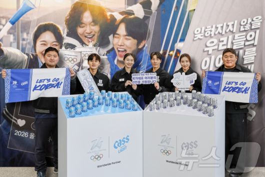 (서울=뉴스1) = 카스가 지난 20일 충북 진천 국가대표선수촌에서 ‘카스 0.0 응원 부스’를 운영했다고 21일 밝혔다. 사진은 양궁 남자 국가대표 김우진 선수, 근대 5종 남자 국가대표 전웅태 선수, 쇼트트랙 여자 국가대표 최민정 선수, 쇼트트랙 남자 국가대표 황대헌 선수, 쇼트트랙 여자 국가대표 김길리 선수, 유도 남자 국가대표 김민종 선수가 현장에 마련된 포토존 앞에서 기념촬영을 하고 있는 모습. (카스 제공. 재판매 및 DB 금지) 2026.1.21/뉴스1