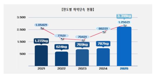 관세청이 지난해 국경단계에서 총 1256건, 3318㎏의 마약류를 적발했다고 21일 밝혔다. 전년 대비 적발 건수는 46%, 중량은 321% 증가하며 건수와 중량 모두 역대 최고치를 경신했다. 직전 기록은 2021년 세운 1054건, 1272㎏의 단속 실적이다.