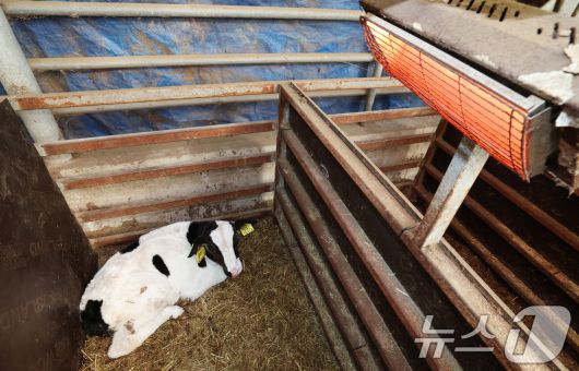 (화성=뉴스1) 김영운 기자 = 강력한 한파가 계속되고 있는 21일 경기 화성시 장안면의 한 축사에서 태어난 지 열흘 가량 된 송아지들이 전기난로를 쬐고 있다. 2026.1.21/뉴스1