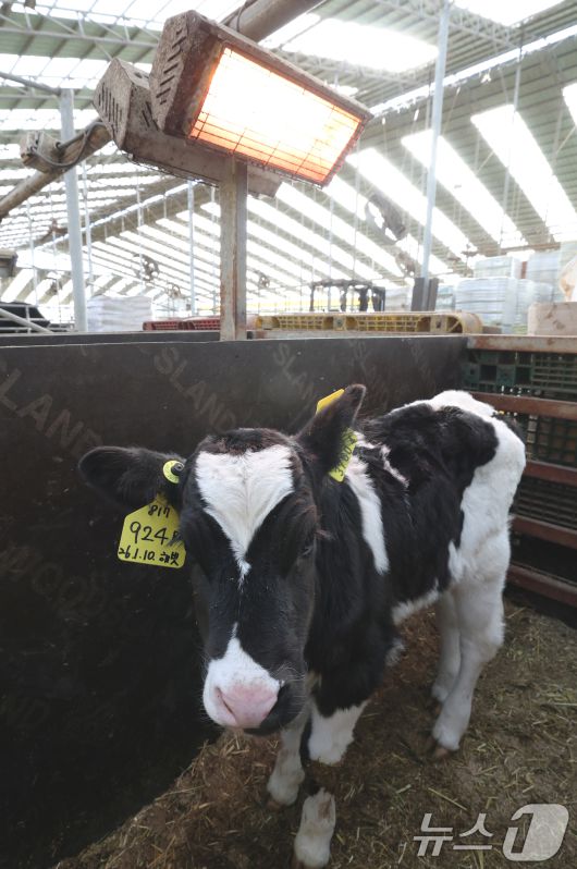 (화성=뉴스1) 김영운 기자 = 강력한 한파가 계속되고 있는 21일 경기 화성시 장안면의 한 축사에서 태어난 지 열흘 가량 된 송아지들이 전기난로를 쬐고 있다. 2026.1.21/뉴스1