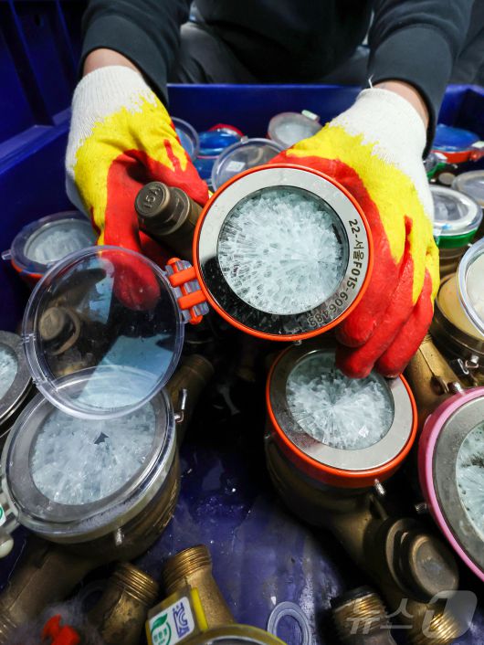 (서울=뉴스1) 김진환 기자 = 서울 전역에 한파주의보가 내려진 21일 서울 강북구 서울북부수도사업소에서 수도계량기 교체반 직원이 동파된 수도계량기를 정리하고 있다. 이날 서울시에 따르면 전날 오후 5시부터 이날 새벽 5시까지 수도 계량기 동파 13건이 집계됐다고 밝혔다. 한랭 질환자나 수도관 동결 피해는 발생하지 않았다. 2026.1.21/뉴스1