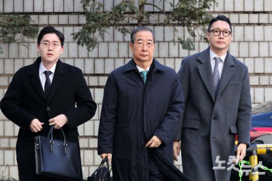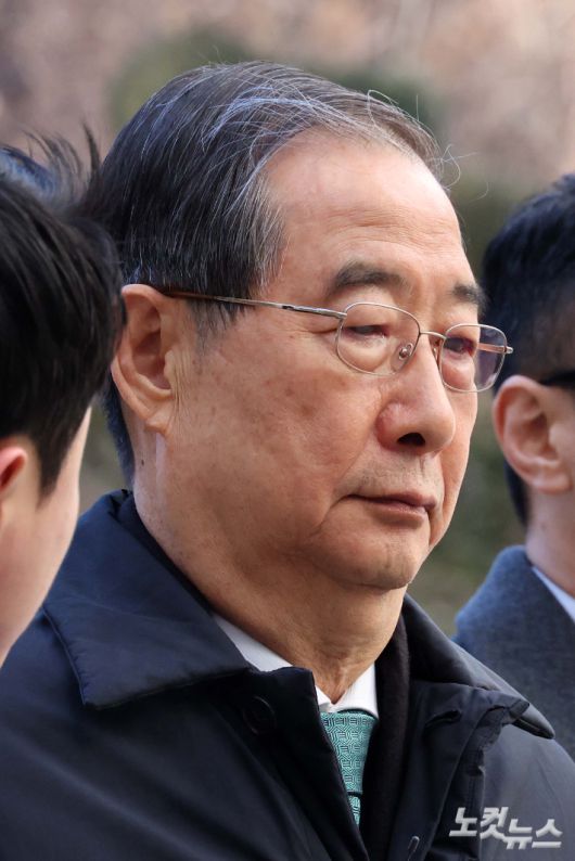 내란 우두머리 방조 혐의를 받는 한덕수 전 국무총리가 21일 서울중앙지법에서 열린 1심 선고 공판에 출석하기 위해 법정으로 향하고 있다.