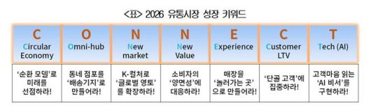 대한상공회의소는 미래 유통산업의 핵심 성장 키워드로 'C.O.N.N.E.C.T'를 선정하며 "앞으로의 경쟁력은 고객과 매장, 인공지능(AI)과 경험을 얼마나 정교하게 연결하느냐에 달려 있다"고 밝혔다.