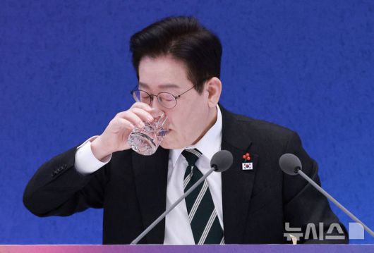 [서울=뉴시스] 고범준 기자 = 이재명 대통령이 21일 청와대 영빈관에서 열린 2026년 신년 기자회견에서 물을 마시고 있다. 2026.01.21. bjko@newsis.com