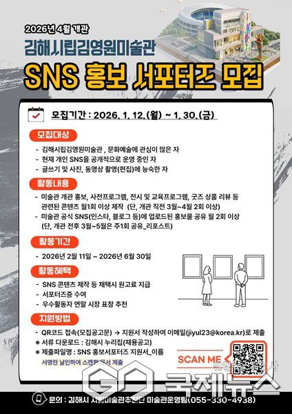 (김해=국제뉴스) 황재윤 기자 = 김해시는 오는 4월 개관 예정인 '김해시립김영원미술관'을 알리고, 미술관의 개관 과정을 생생하게 기록하고 홍보할 'SNS 홍보 서포터즈'를 모집한다고 21일 밝혔다.