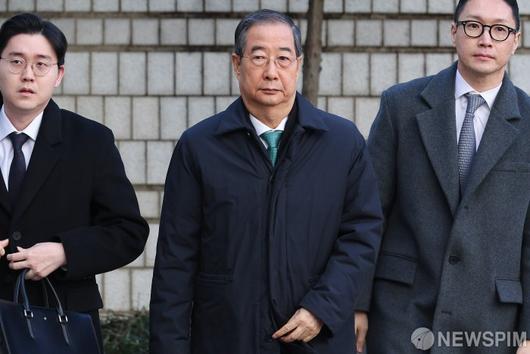 [서울=뉴스핌] 류기찬 기자 = 한덕수 전 국무총리가 21일 오후 서울 서초구 서울중앙지방법원에서 열린 내란 방조 및 내란 중요임무 종사 혐의 관련 1심 선고 공판에 출석하고 있다. 2026.01.21 ryuchan0925@newspim.com