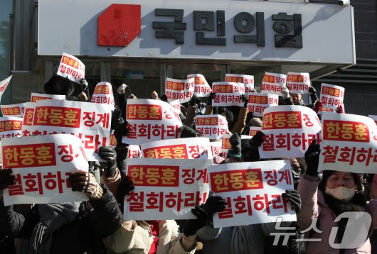 (대구=뉴스1) 공정식 기자 = 21일 오후 대구 수성구 국민의힘 대구시당 앞에서 한동훈 전 대표 지지자들이 한 전 대표의 당원 게시판 사건과 관련 당 징계 철회를 촉구하는 집회를 열고 있다. 2026.1.21/뉴스1