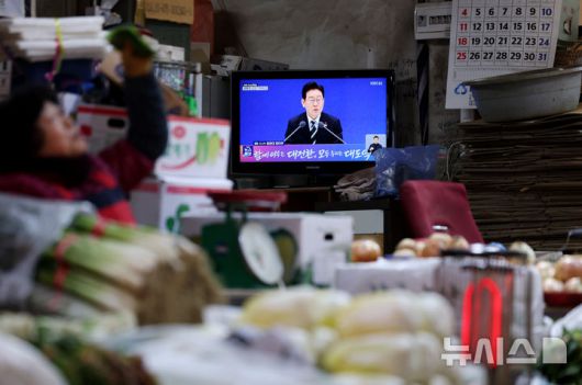 [서울=뉴시스] 김진아 기자 = 21일 서울 서대문구 인왕시장의 한 상점에 이재명 대통령의 신년 기자회견이 TV를 통해 생중계 되고 있다. 2026.01.21. bluesoda@newsis.com |