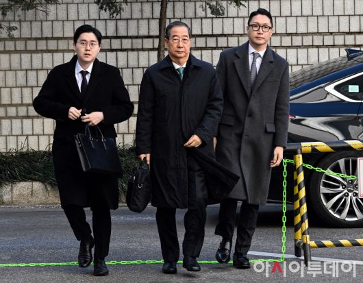 아시아투데이 송의주 기자 = 한덕수 전 국무총리가 21일 서울 서초구 서울중앙지방법원에서 열린 '내란 우두머리 방조' 혐의 1심 선고 공판에 출석하고 있다.