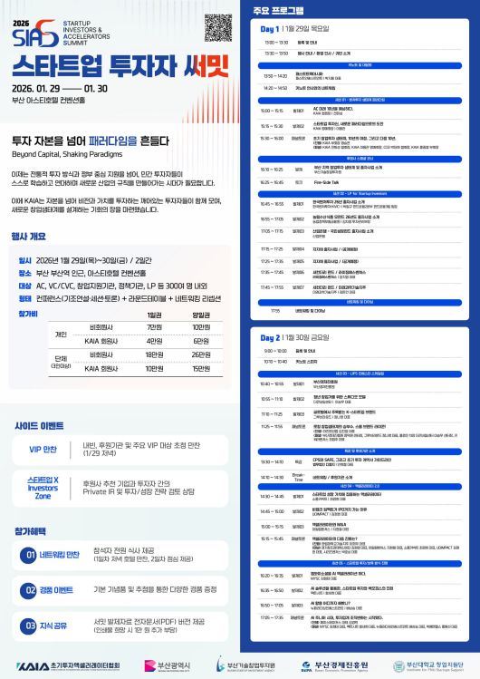 초기투자액셀러레이터협회(KAIA)는 오는 29일부터 30일까지 부산에서 개최하는 ‘2026 스타트업 투자자 서밋’ 주요 프로그램과 연사진을 공개했다.