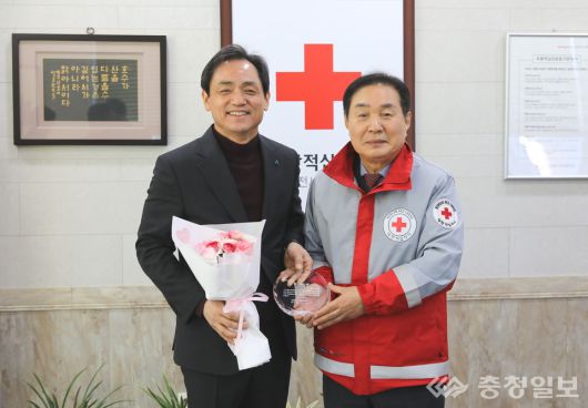 정국영 대전도시공사 사장(왼쪽)이 정상직 대한적십자사 대전세종지사회장으로부터 지속적인 사회공헌 활동에 대한 공로를 인정받아 감사패를 전달받고 있다 |