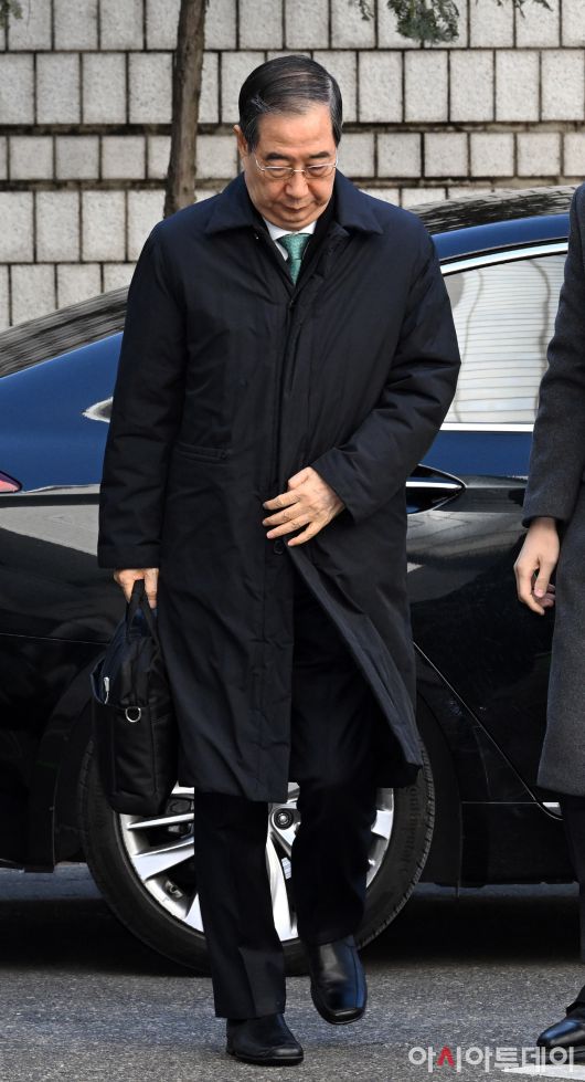 아시아투데이 송의주 기자 = 한덕수 전 국무총리가 21일 서울 서초구 서울중앙지방법원에서 열린 '내란 우두머리 방조' 혐의 1심 선고 공판에 출석하고 있다.