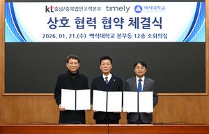 백석대학교(총장 송기신)는 21일 교내 본부동에서 KT 충남/충북법인고객본부, Timely와 'AI 산업 변화 대응 및 실무 인재 양성을 위한 산학협력 협약(MOU)'을 체결했다.