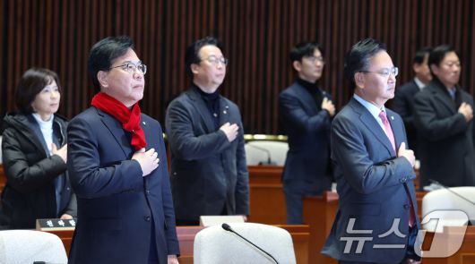 (서울=뉴스1) 신웅수 기자 = 송언석 국민의힘 원내대표가 21일 서울 여의도 국회에서 열린 긴급 의원총회에서 국민의례를 하고 있다. 2026.1.21/뉴스1phonalist@news1.krCopyright ⓒ 뉴스1. All rights reserved. 무단 전재 및 재배포, AI학습 이용 금지.