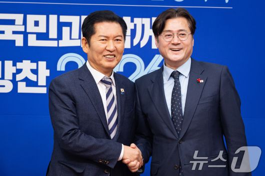 (서울=뉴스1) 유승관 기자 = 정청래 더불어민주당 대표가 21일 서울 여의도 국회에서 홍익표 청와대 신임 정무수석을 접견, 기념 촬영을 하고 있다. 2026.1.21/뉴스1