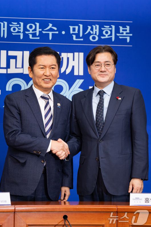 (서울=뉴스1) 유승관 기자 = 정청래 더불어민주당 대표가 21일 서울 여의도 국회에서 홍익표 청와대 신임 정무수석을 접견, 기념 촬영을 하고 있다. 2026.1.21/뉴스1