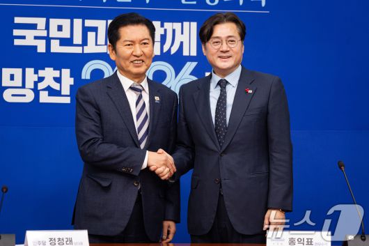 (서울=뉴스1) 유승관 기자 = 정청래 더불어민주당 대표가 21일 서울 여의도 국회에서 홍익표 청와대 신임 정무수석을 접견, 기념 촬영을 하고 있다. 2026.1.21/뉴스1