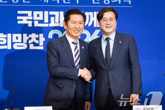 (서울=뉴스1) 유승관 기자 = 정청래 더불어민주당 대표가 21일 서울 여의도 국회에서 홍익표 청와대 신임 정무수석을 접견, 기념 촬영을 하고 있다. 2026.1.21/뉴스1fotogyoo@news1.krCopyright ⓒ 뉴스1. All rights reserved. 무단 전재 및 재배포, AI학습 이용 금지.