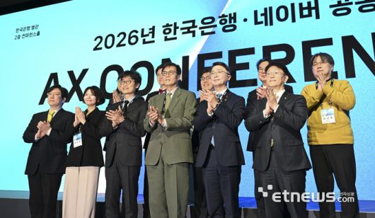 2026년 한국은행·네이버 공동 AX 콘퍼런스가 21일 서울 중구 한국은행에서 열렸다. 이창용 한국은행 총재와 이해진 네이버 창업자 겸 이사회 의장이 주요 내빈들과 기념사진을 촬영하고 있다. 앞줄 왼쪽 두번째부터 최수연 네이버 대표, 이해진 의장, 이창용 총재, 류제명 과학기술정보통신부 제2차관. 김민수기자 mskim@etnews.com [Copyright © 전자신문. 무단전재-재배포금지]