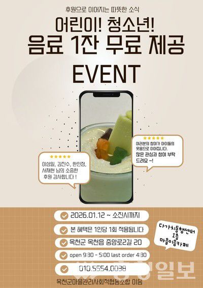 마을이음_카페 어린이와 청소년을 무료 음료 이벤트 포스터. |